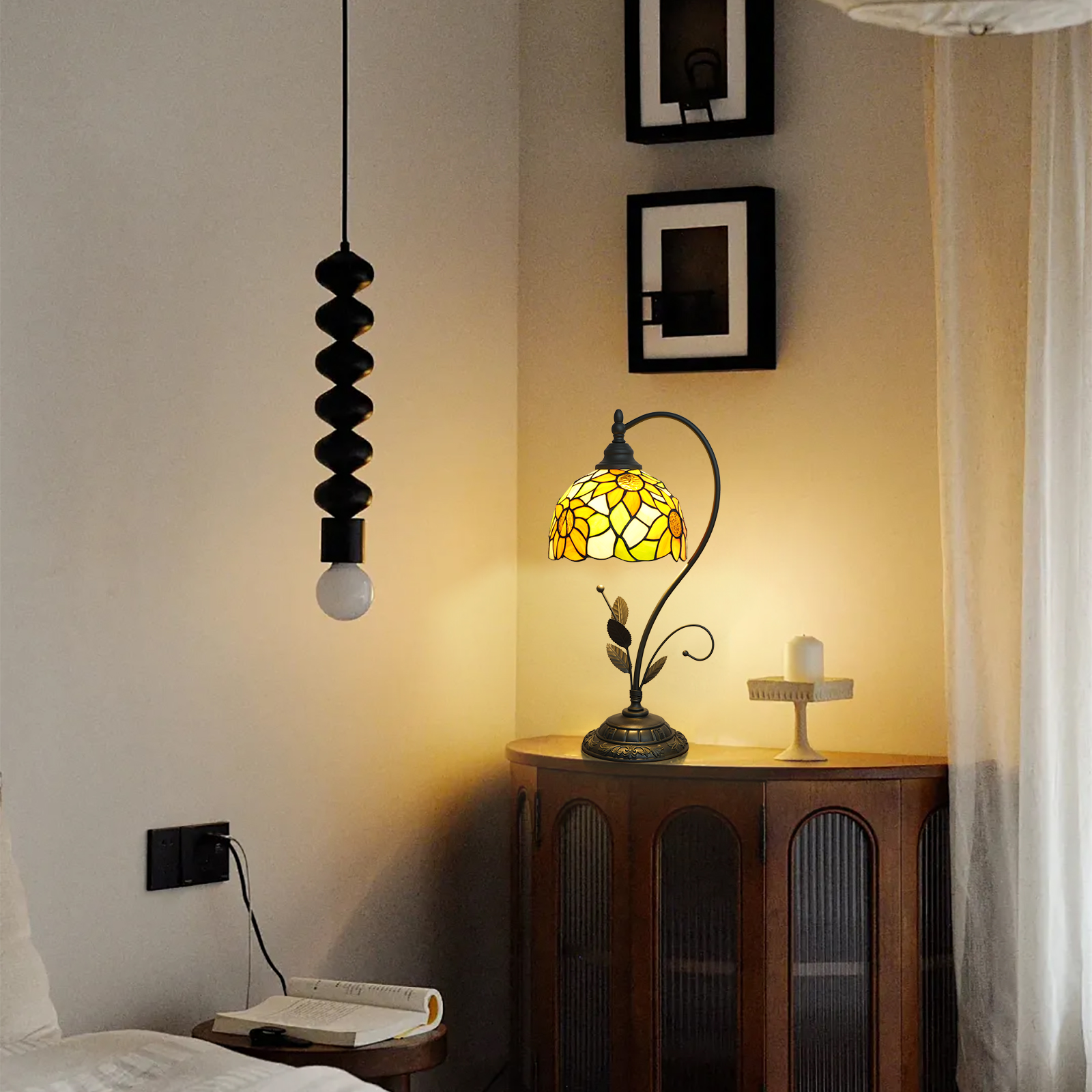 灯柱用铁艺锻造,却脱离了坚硬僵硬的“金属”,变身为模仿花茎的动态曲线。曲率经过反复调整,以确保灯罩的悬挂角度精确地照亮桌子的核心区域。同时,灯柱从底座看起来就像一个“发芽生长”的花茎。缠绕在一起的铁艺叶子纹理清晰,花蕾细小而暴露,仿佛是依附在向日葵茎上的生命力。园丁手中的“生动的花灵”被凝固成一个永远不会枯萎的立体雕塑。让灯具从它们的“工具”属性中挣脱出来,成为生长在空间中的艺术。(2)树脂底座——稳固的艺术基础底座由树脂制成,并用复古的做旧工艺打磨而成。表面雕刻的精致图案,就像是从欧洲古典家具中采摘下来的时间碎片。直径为15.7CM(6.2英寸)的它,看似“坚固”,但实际上,它隐藏了平衡的智慧——它可以支撑50CM(20英寸)高的灯体。无论是放在窄边床头柜上还是大桌子上,它都保持着稳定和坚固。它以其“轻描淡写的重量”支撑着整个灯的艺术轻盈,确保每次点亮时,杜成空间和美学的相互追求。三。实用细节:隐藏在美学中的巧妙创意自由生长的“电线”:163CM(64英寸)长的电线,就像从花茎延伸出来的藤蔓,适用于各种空间布局——即使插座藏在角落里,或者桌面远离墙壁,也不需要被电线束缚。独立开关设计,是触手可及的温柔触感。睡前无需在黑暗中搜寻。早上只需按下一个按钮,就可以唤醒“花海晨光”,让仪式感融入每一次开合。空间的“万能适配器”:直径25CM(10英寸)的灯罩,提供精确而克制的光线覆盖。放在卧室的床头柜上,是伴随睡眠的温柔光芒。读几页书,或做一会儿白日梦,都被花海柔和的波浪所笼罩。将它放在客厅的边桌上,与真皮沙发和藤椅相得益彰,营造出老友围坐的背景氛围。放在书房的书桌上,彩色玻璃过滤的光线缓解了眼睛的疲劳,让灵感在花影中悄然生长——它不仅仅是一盏灯,而是空间风格的“点睛之笔”,为复古、北欧、艺术等色调增添了独特的魅力。四。复古豪宅:在老别墅的雕花壁炉旁,与真皮沙发、藤篮共享旧日时光,像在祖母阁楼里捡到的宝贝,延续着空间的优雅叙事,让岁月积淀的魅力在光影的玩弄中日渐醇厚。北欧住宅:在简约的木质家具中,是活泼的艺术音符。彩色玻璃打破了单调,“激情花海”平衡了冷酷,使家既与木头一起放松,又充满艺术张力。清晨的咖啡香气与温暖的灯光交融,每一天都弥漫着花田的甜蜜。艺术工作室:在咖啡店的角落里,在手工工作室的办公桌上,它充当了一个“氛围催化剂”——温暖的光线洒在咖啡杯上,照在手工银首饰的细微光线上。顾客拍照时,灯光的艺术感也成为拍照的亮点,让空间的故事通过光影和镜头被进一步传达。从手工彩色玻璃的温度到铁艺花枝的匠心,再到树脂底座的沉淀,这盏灯是一首“可触摸的光影诗”。欢迎它进入你的家,你会珍惜一片永不褪色的向日葵田,蒂芙尼工艺的遗产,以及无数轻轻浸泡在其中的日常时刻——毕竟,不是每盏灯都能永远在你的生活中种植阳光的形状。
