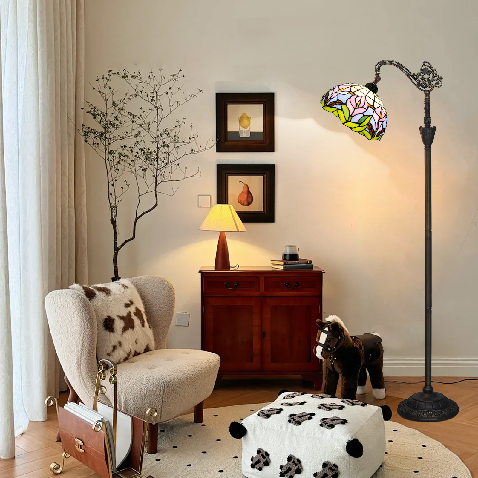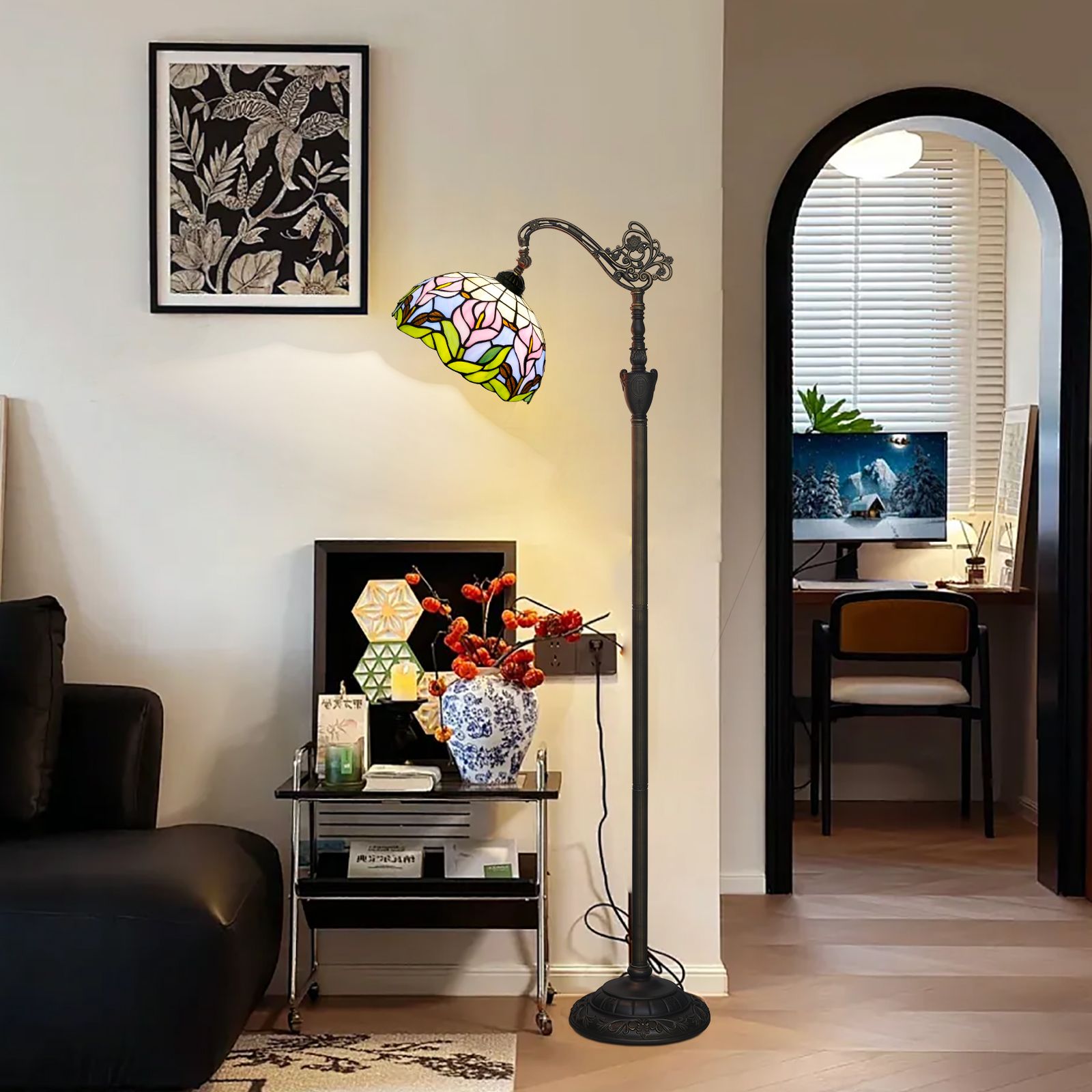蒂芙尼风格落地灯的制作离不开传统的手工艺品。彩色玻璃的切割拼接,金属支架的雕刻焊接,每一步都需要工匠的手工操作,体现了他们的辛勤劳动和技能。在当前机械化生产的主流中,这种对传统手工工艺的坚持显得尤为珍贵。每一盏蒂芙尼风格落地灯都是一件独特的艺术品,因为在手工制作过程中难免会有一些细微的差异,而这些差异正是其独特性和价值所在。它传递出一种对传统工艺的尊重和传承的情感,让人们意识到传统工艺并不过时,而是具有永恒的艺术魅力和文化价值,值得保护和传承。(3)对生活美学的追求选择蒂芙尼风格落地灯的人往往是对生活美学有高度追求的人。它不仅仅是一种照明工具,更是一个人生活态度的反映。它代表了人们对单调乏味生活的不满,以及将艺术与美融入日常生活的渴望,让生活更精致、更有格调。当人们将这款落地灯引入家居空间时,它以具象的方式表达了对美学生活的追求,希望通过艺术家装提升生活的品质和幸福感,让每一天的生活都在艺术的氛围中展开。五、结语蒂芙尼风格的落地灯,以其绚丽的彩色玻璃、精湛的金属工艺、稳定的底座设计,以及在空间装饰和文化情感传递方面的多元价值,成为家居装饰中一道亮丽的风景。它不仅仅是照明的工具,更是光与艺术的诗意邂逅,是自然、工艺、美学生活的完美融合。在它存在的每一个空间里,都能感受到艺术的气息、自然的美好、生活的诗意,它就像一个无声的艺术使者,透过光影讲述关于美、关于文化、关于生活的故事,为人们的家居生活增添无穷的魅力和温暖。