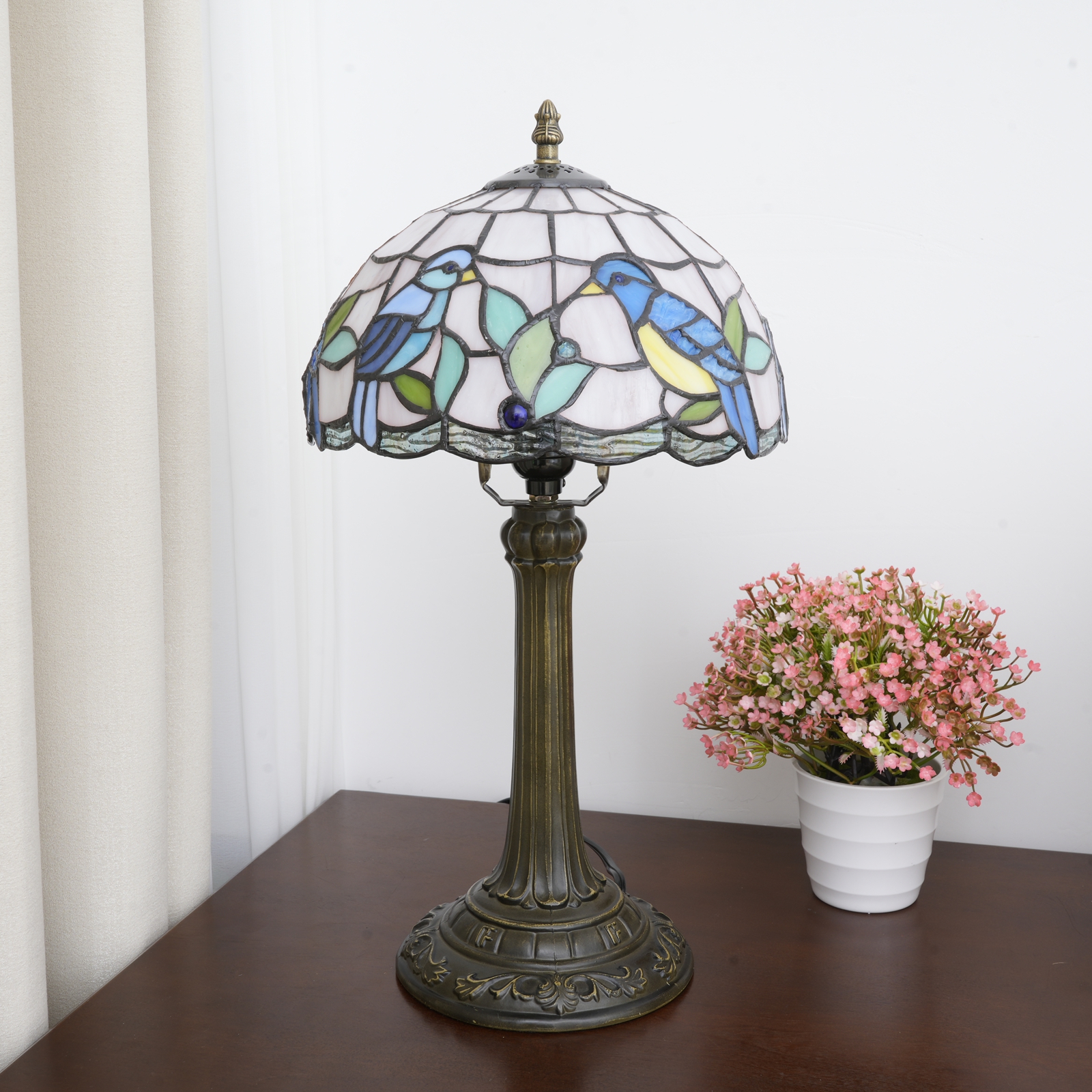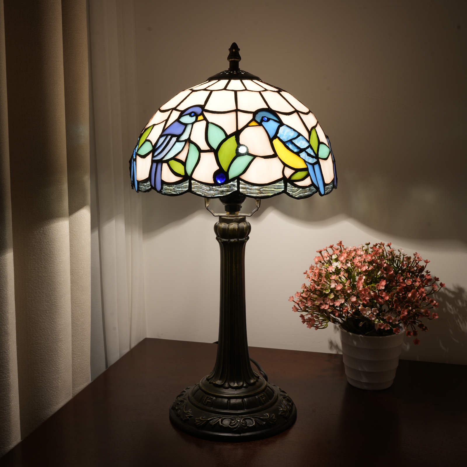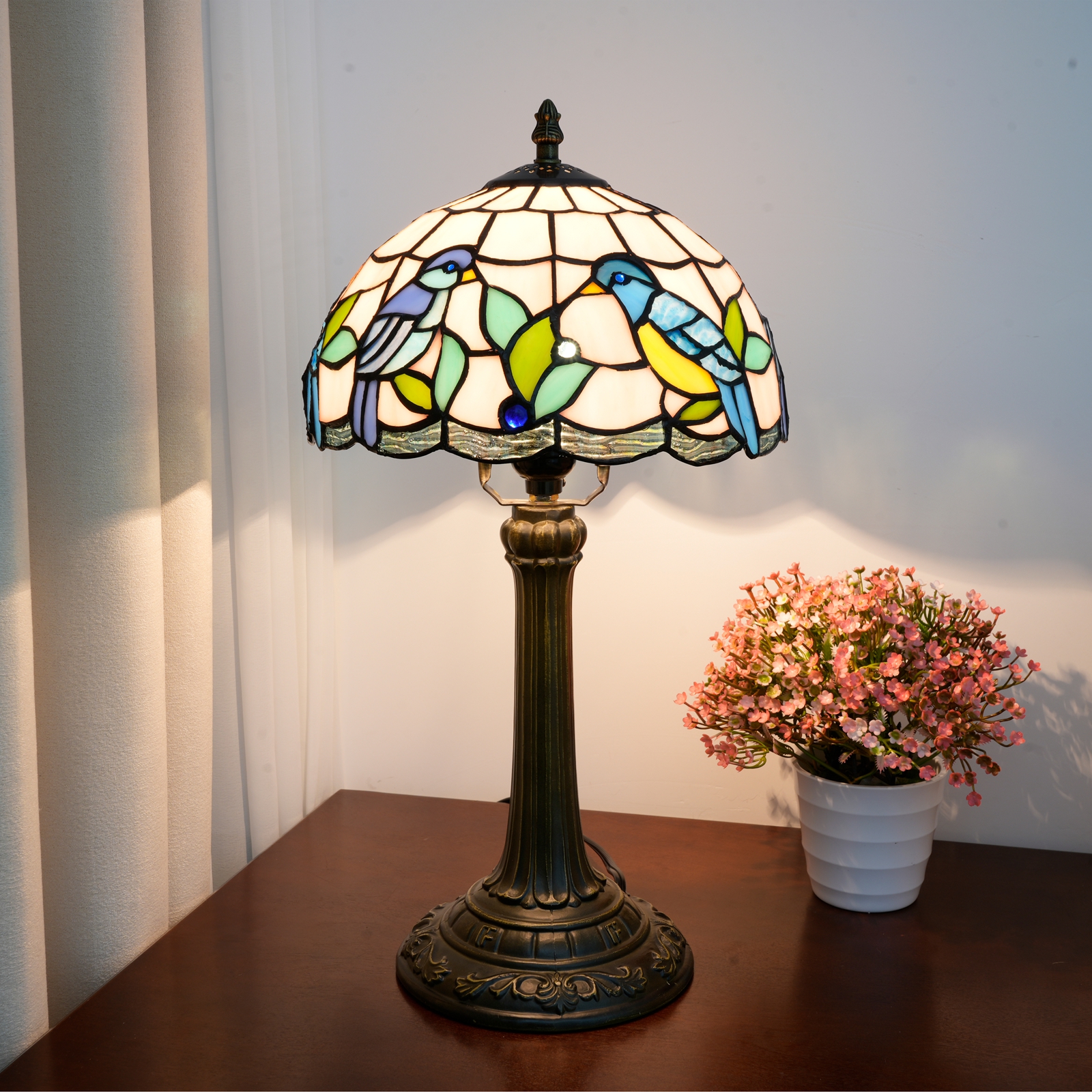 谁知道呢!打开包装的那一刻,仿佛把整个春天的鸟语花香都带回了家。最近,这款蒂芙尼风格的彩色玻璃台灯让我感慨万千。磨砂玻璃盖上,两只蓝羽小鸟在嫩绿的水草间窃窃私语。浅蓝色、浅黄色和浅绿色的玻璃色块就像是被阳光柔化的春天调色板,就连金属饰条的线条也有着柔和的弧线🌿能触摸到的“复古质感”真心受到细节爱好者的喜爱。拿到手的第一印象是“扎实”的灯罩是用正品彩色玻璃拼接而成的(不是低价贴纸!)手指轻轻一弹,就能感受到玻璃的质感,每个色块都是手工缝制在一起的,开灯的那一刻才是真正的亮点:暖黄色的光线从玻璃的缝隙中渗出,鸟儿羽毛的边缘发出柔和的光芒,甚至投在墙上的阴影也被打上了图案,仿佛春天的树荫被带进了房间。灯柱和底座由老化的铝合金制成,恢复了古铜色的雕刻底座很重,放在床头柜上不会摇晃。柱形灯柱的图案是复古的皇家风格,与木桌或轻奢橱柜搭配起来不会显得格格不入。一根145厘米长的电线,带有中段开关。不用弯腰就能够到插座,躺在沙发上的时候伸手按一下就好了,对懒人超级友好。这盏灯是个“气氛欺骗器”。我现在把它放在书桌的角落里。白天,它是个装饰物品,阳光打在玻璃罩上,小鸟图案会在桌子上投下细小的光点。晚上开着它加班,暖暖的灯光没有白光那么刺眼。玻璃上的小鸟似乎在暖黄色里活了过来,连键盘上打字的节奏都慢了半拍。偶尔睡前打开它,卧室仿佛被柔软的滤镜包裹着,连梦里都弥漫着春天的气息。事实上,最打动我的是“温暖感”——而不是流水线上的工业产品。每一块玻璃拼接,每一道弧线雕刻,都承载着手工制作的质朴与柔情,仿佛生活中的小浪漫被封在了这个发光的玻璃盒子里。