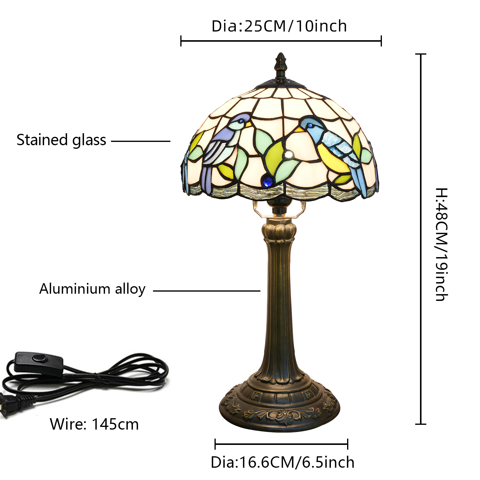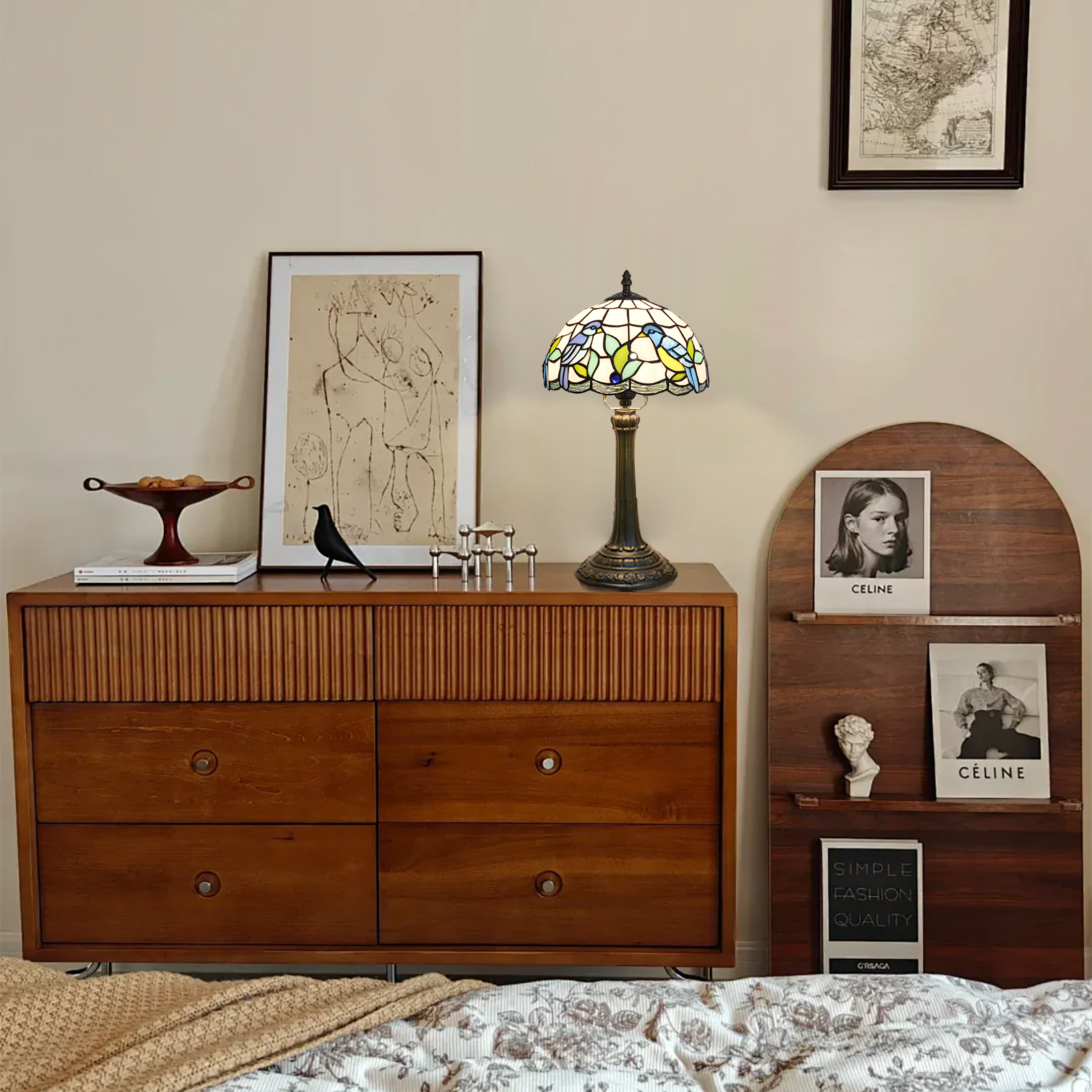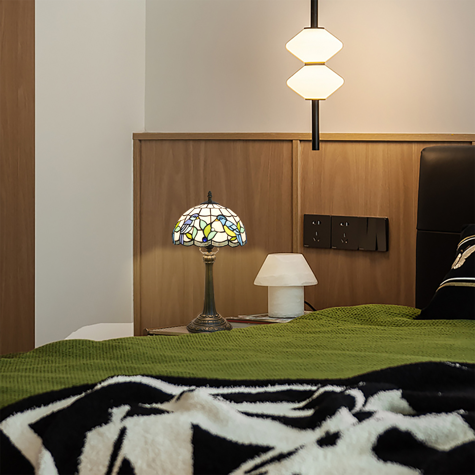谁知道呢!打开包装的那一刻,仿佛把整个春天的鸟语花香都带回了家。最近,这款蒂芙尼风格的彩色玻璃台灯让我感慨万千。磨砂玻璃盖上,两只蓝羽小鸟在嫩绿的水草间窃窃私语。浅蓝色、浅黄色和浅绿色的玻璃色块就像是被阳光柔化的春天调色板,就连金属饰条的线条也有着柔和的弧线🌿能触摸到的“复古质感”真心受到细节爱好者的喜爱。拿到手的第一印象是“扎实”的灯罩是用正品彩色玻璃拼接而成的(不是低价贴纸!)手指轻轻一弹,就能感受到玻璃的质感,每个色块都是手工缝制在一起的,开灯的那一刻才是真正的亮点:暖黄色的光线从玻璃的缝隙中渗出,鸟儿羽毛的边缘发出柔和的光芒,甚至投在墙上的阴影也被打上了图案,仿佛春天的树荫被带进了房间。灯柱和底座由老化的铝合金制成,恢复了古铜色的雕刻底座很重,放在床头柜上不会摇晃。柱形灯柱的图案是复古的皇家风格,与木桌或轻奢橱柜搭配起来不会显得格格不入。一根145厘米长的电线,带有中段开关。不用弯腰就能够到插座,躺在沙发上的时候伸手按一下就好了,对懒人超级友好。这盏灯是个“气氛欺骗器”。我现在把它放在书桌的角落里。白天,它是个装饰物品,阳光打在玻璃罩上,小鸟图案会在桌子上投下细小的光点。晚上开着它加班,暖暖的灯光没有白光那么刺眼。玻璃上的小鸟似乎在暖黄色里活了过来,连键盘上打字的节奏都慢了半拍。偶尔睡前打开它,卧室仿佛被柔软的滤镜包裹着,连梦里都弥漫着春天的气息。事实上,最打动我的是“温暖感”——而不是流水线上的工业产品。每一块玻璃拼接,每一道弧线雕刻,都承载着手工制作的质朴与柔情,仿佛生活中的小浪漫被封在了这个发光的玻璃盒子里。